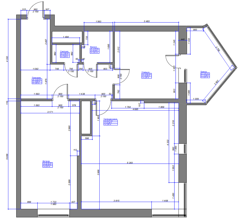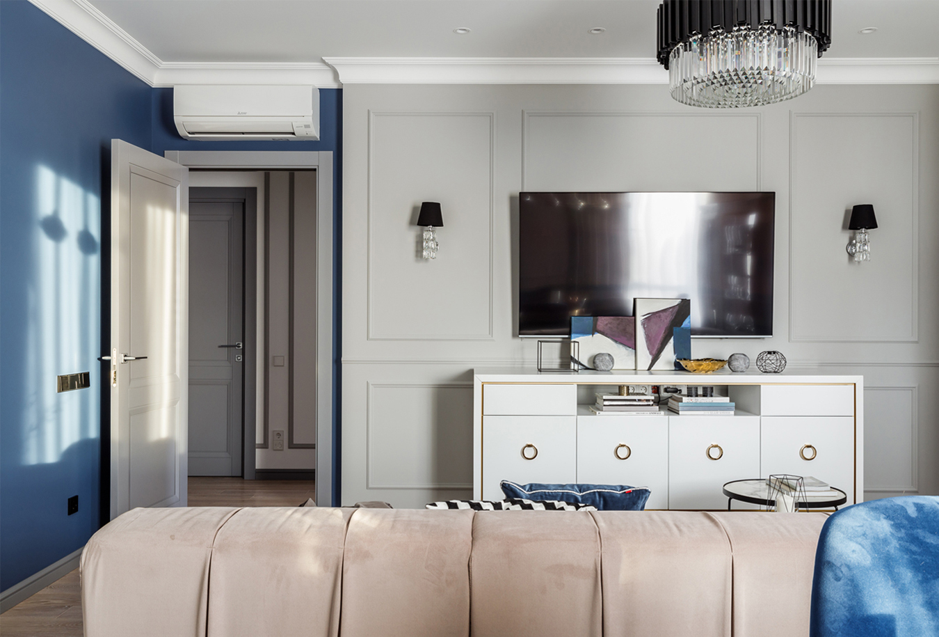 Хозяйка просила создать нарядный интерьер в серо-белой гамме, в процессе создания проекта мы добавили акцентный синий цвет.