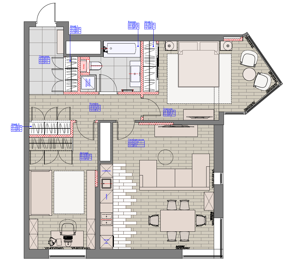 Самое главное было улучшить планировку. Была не очень удачная входная группа, мы ее исправили. И нашли много места для шкафов. Увеличить спальню также удалось.
