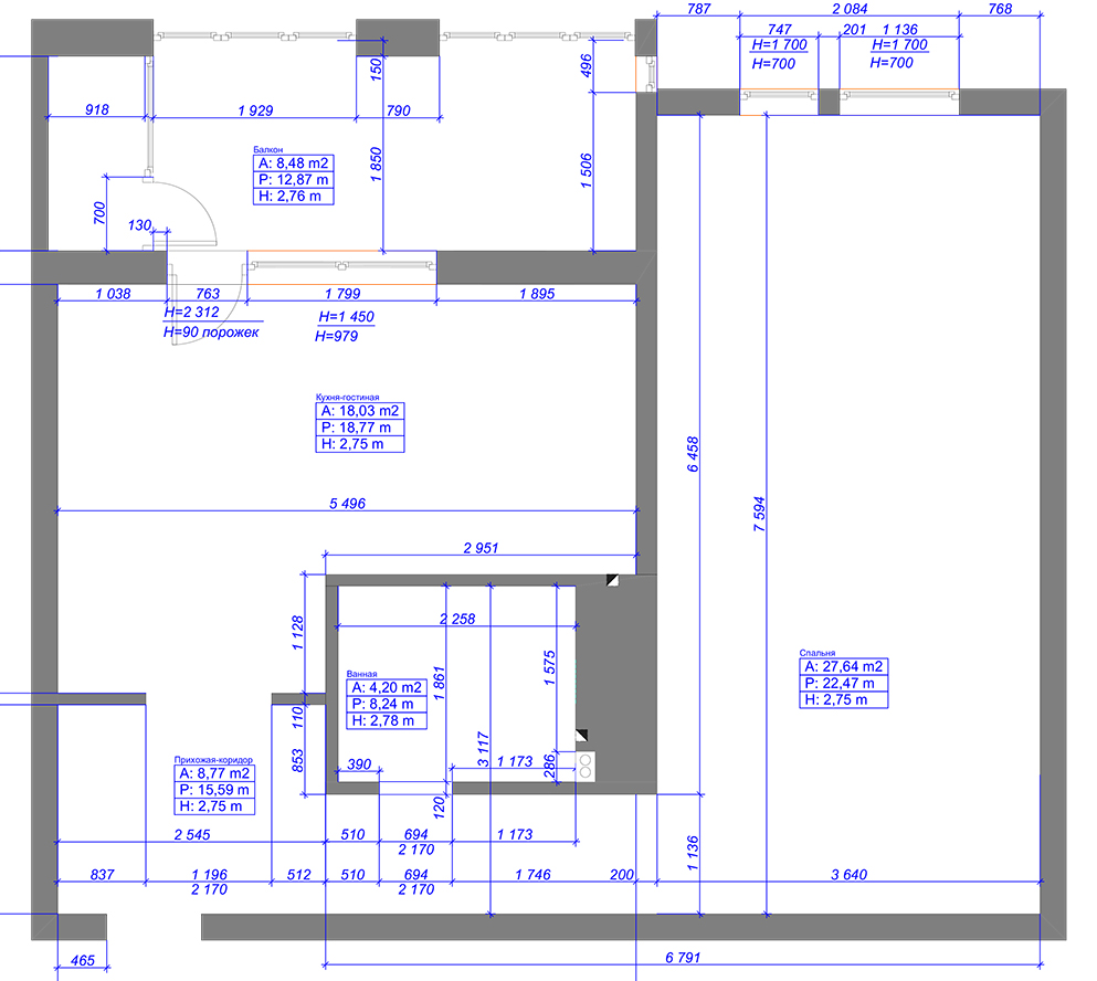 Квартира сдавалась в бетоне, и первым делом в ней убрали всё, что можно. Не трогали разве что блок санузла, добавив к нему большой гардеробный шкаф со стороны прихожей.