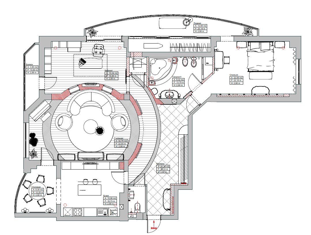 Конечно, нужно было переделать планировку, так как надо было добавить новых помещений - большой гардероб и кабинет. Новая планировка построена на круге и создала центр для всей квартиры в виде круглой гостиной.