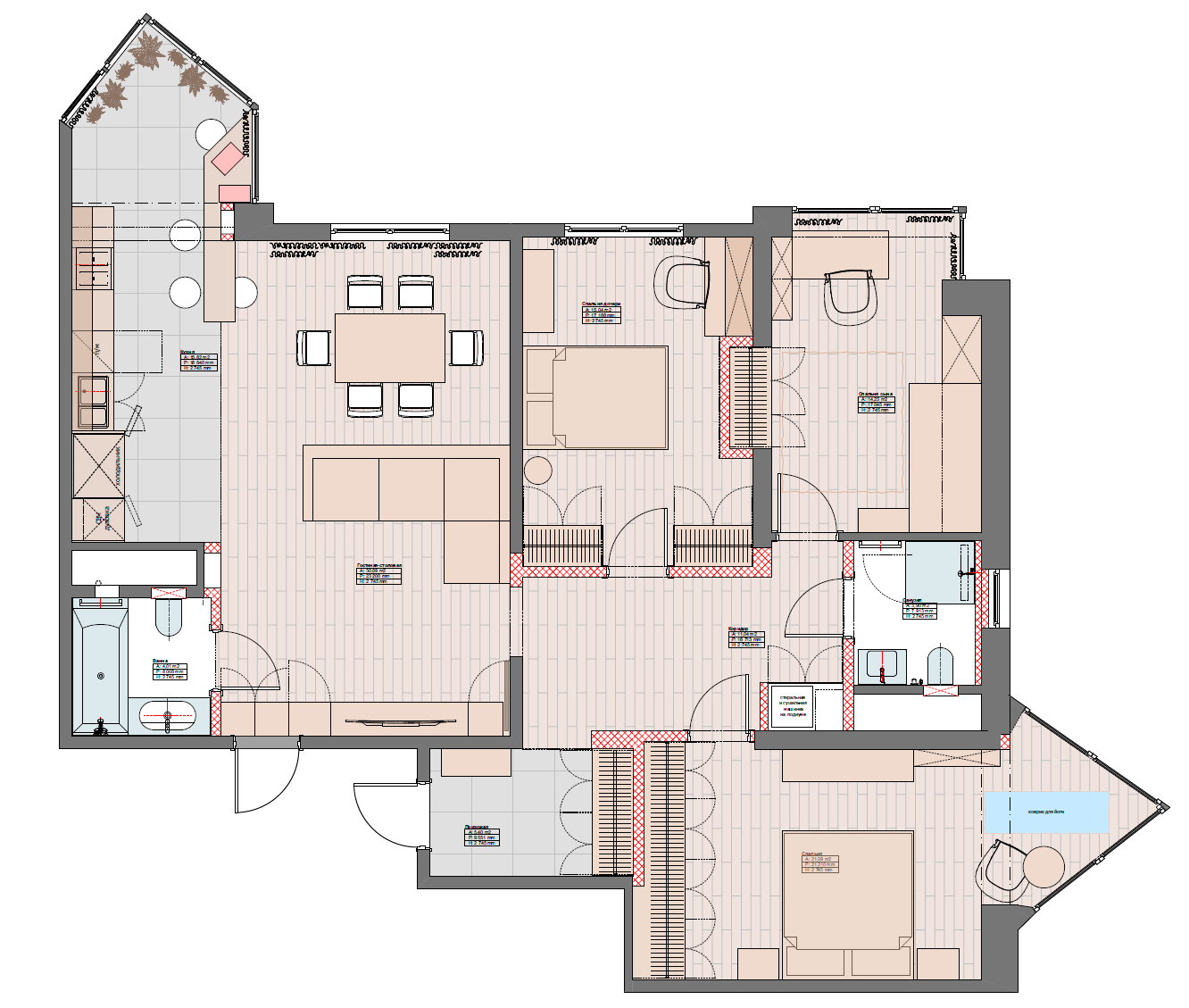 Важно было разработать планировку в контексте соединения двух квартир в одну. Мы перебрали много вариантов, так как входа было два и соответственно вариантов то же было больше.