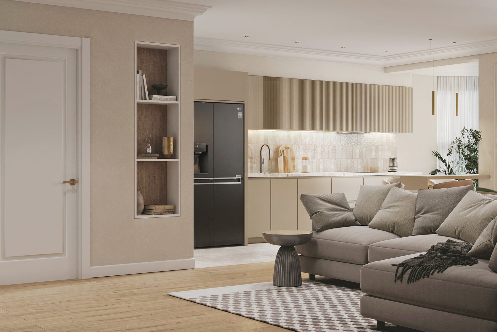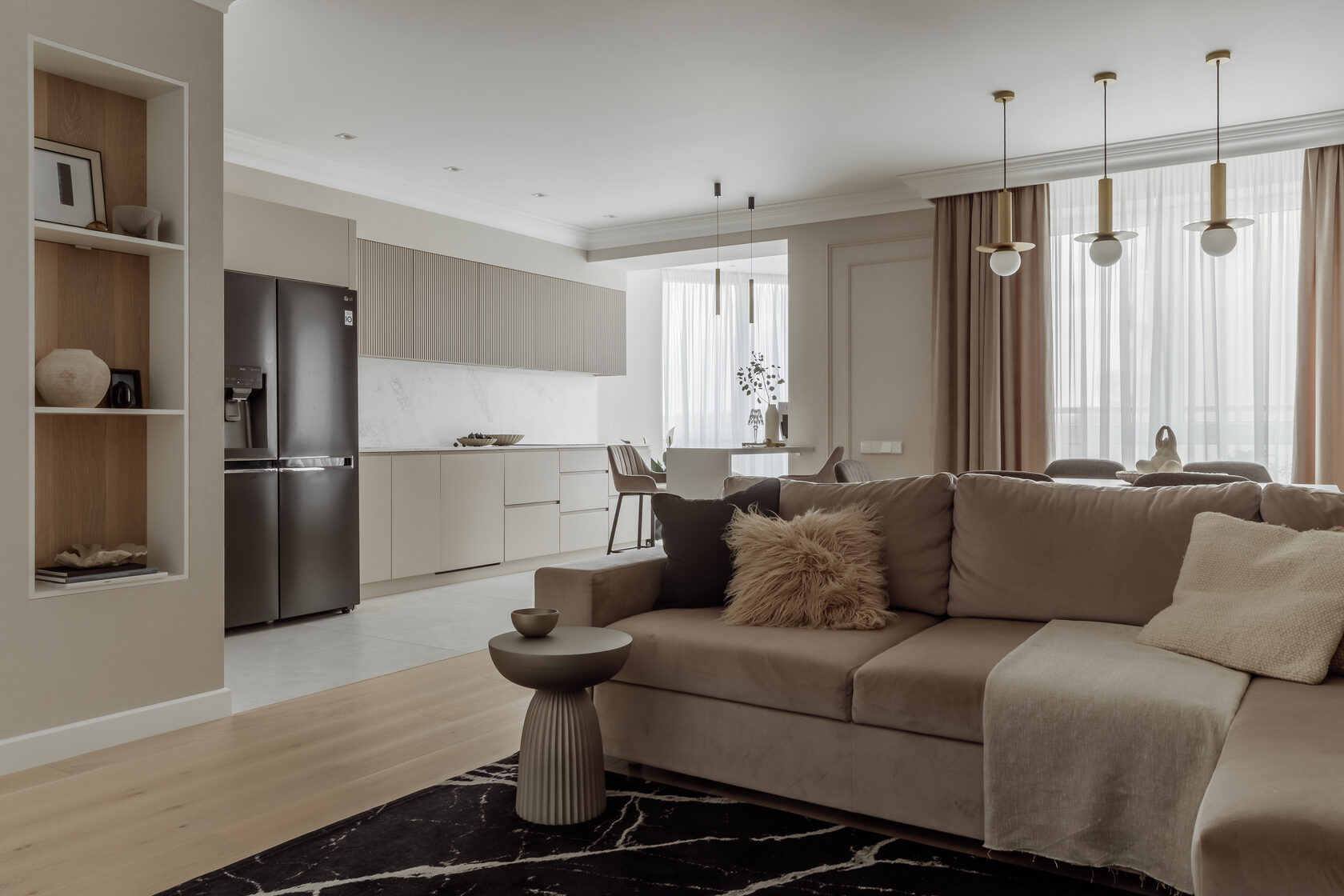 А гипсовые полосы на стенах, мягкого кофейного оттенка, дают связь с фасадами кухни. В ходе финального декорирования пришла идея собрать черным графичным ковром зону дивана, поддержав этим черный телевизор и технику.