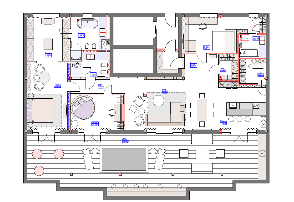 База планировки была удачная, но мы ее насытили более плотно, появилась еще одна спальня, постирочная и все хранения встали на нужные нам места.