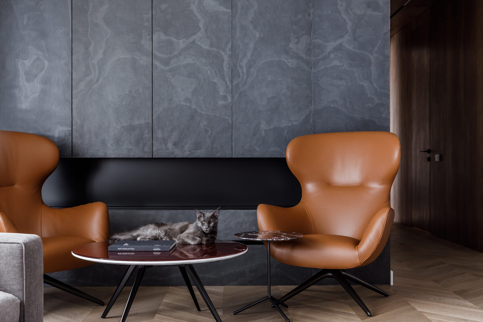 Много работы было в подборе материалов, например, при выборе оттенков панелей, среди казалось бы, "одинаково серых", важны были нюансы и именно наш серый. Акцентами стали рыжий в коже, оттенок ореха в шпоне и винно-бордовые штрихи.