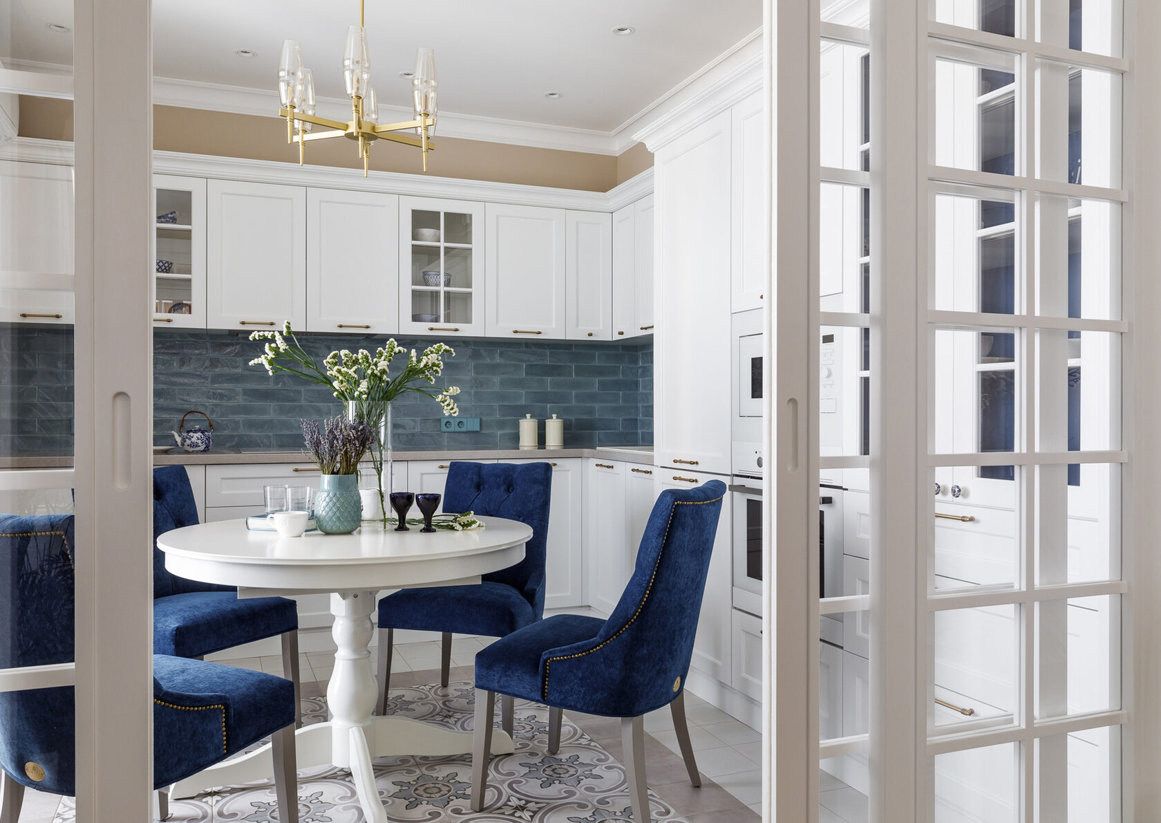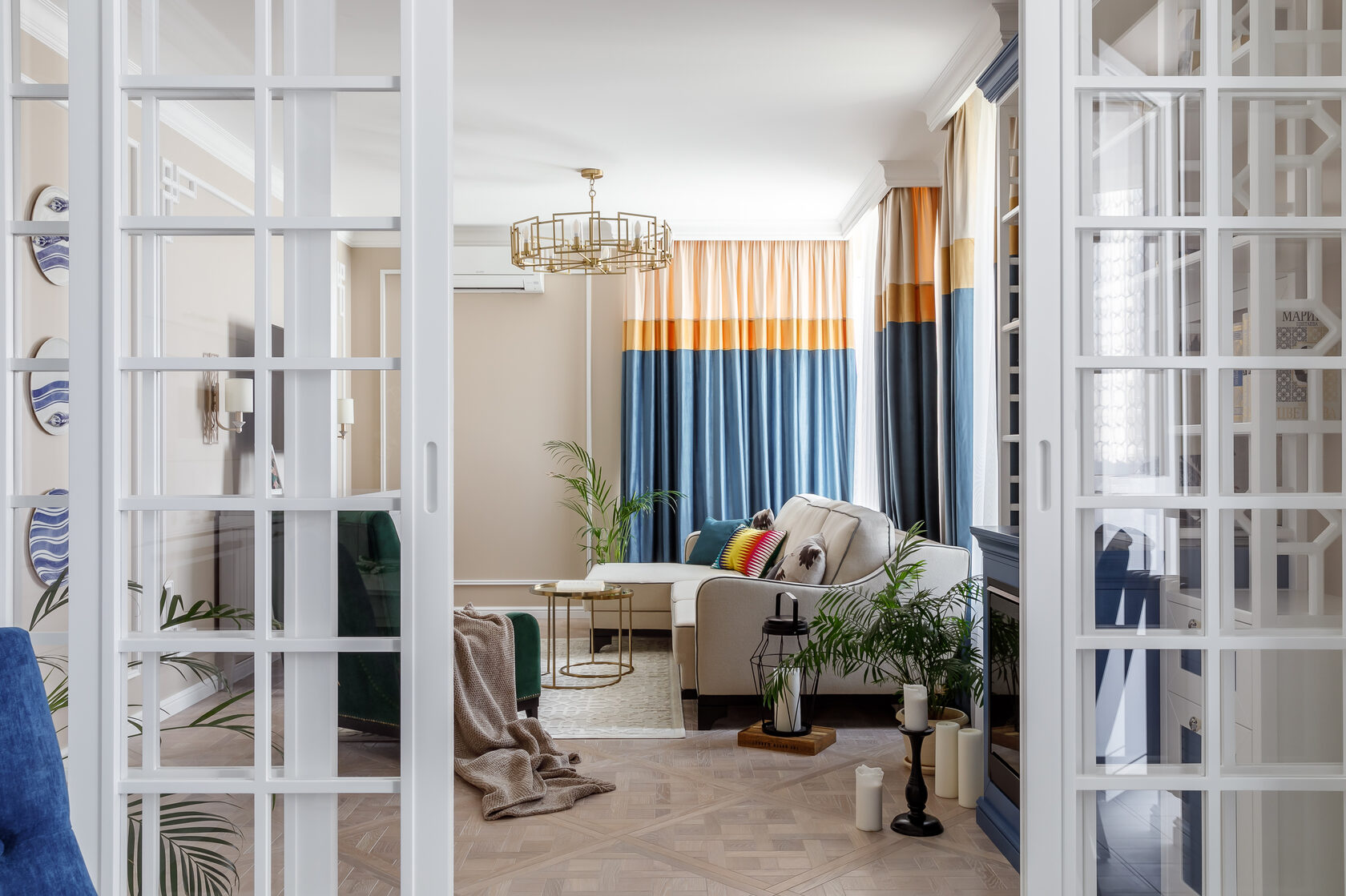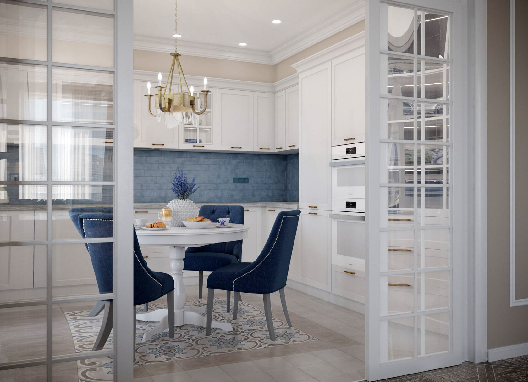 Использовали отсылки к французскому интерьеру и востоку в некоторых геометриях мебели и дверей.